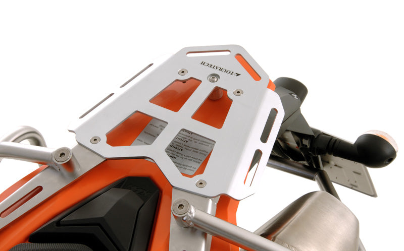 Міцна полиця для багажу надзвичайно корисна під час одноденних і тривалих подорожей. Рама з нержавіючої сталі є основою для конструкції з 4 мм алюмінію. Закріпити кофр або дорожню сумку на задній частині KTM не може бути простіше або швидше. А кришка бака ззаду залишається доступною. Розмір конструкції 22х20 см. Багажник розрахований на навантаження до 5 кг. Багажник 051-0170 легко поєднується з багажником.