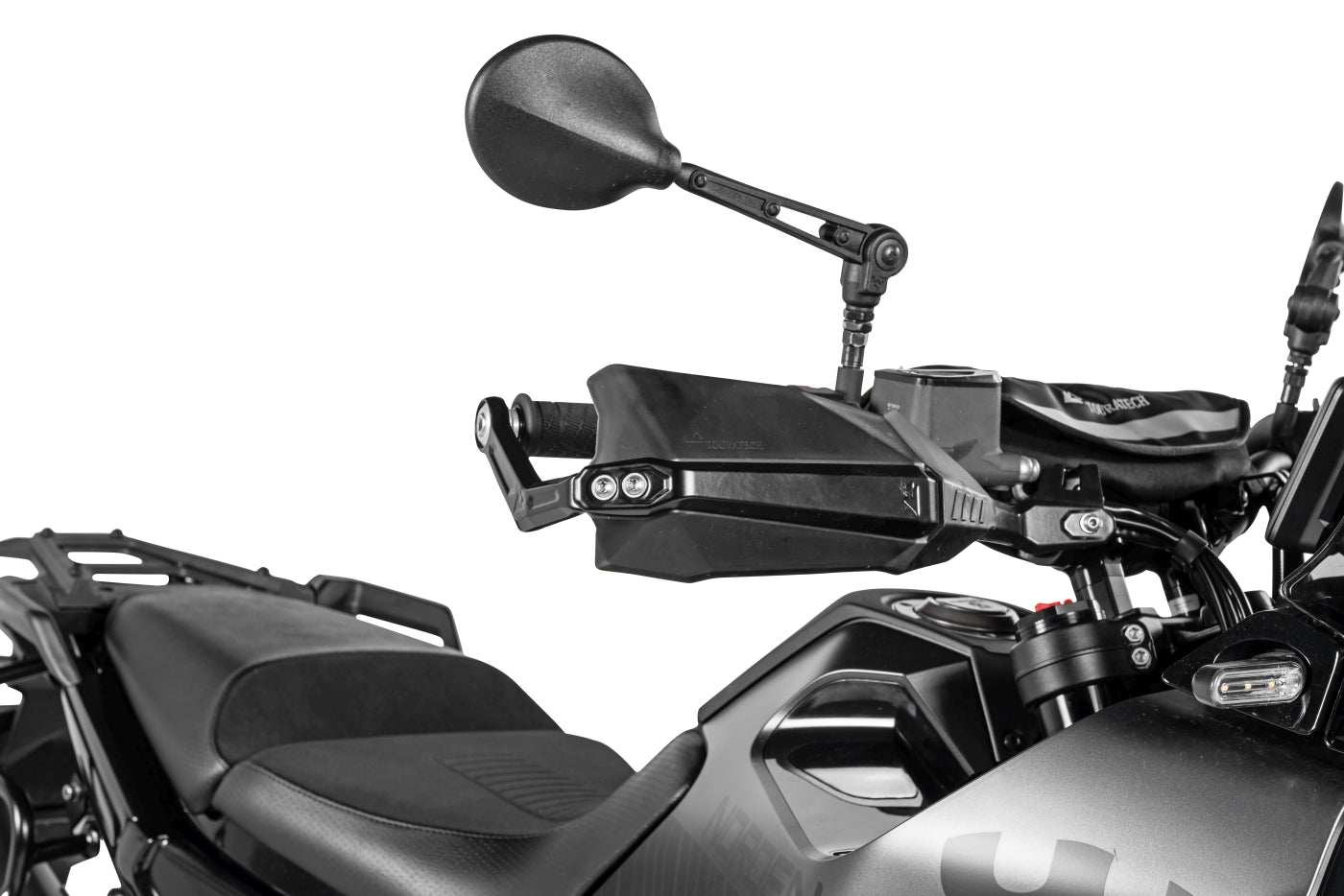 Незалежно від того, мандрівките по бездоріжжю чи подорожуєте - Touratech Defensa пропонує надійний захист для рукояток і ручок, щоб незначна невдача не перетворилася на серйозну проблему. З Defensa Touratech розробила надміцний протектор для арматури керма та рук. Конструкція з високоміцного авіаційного алюмінію точно адаптована до вашої моделі мотоцикла. Завдяки системі «Defensa System» протектор пропонує цікаві можливості варіації. Незалежно від того, чи ви обираєте чистий протектор або широкий протектор із додатковим спойлером... Захисти рук Defensa - для особливо широкого спектру використання. Фітинги керма є одними з найбільш вразливих вузлів на мотоциклі. Міцний протектор надійно захищає важелі від пошкоджень. Закриті протектори мають кронштейн, який підтримується біля затискних блоків, а також на кінці керма, таким чином повністю обрамляючи арматуру. Цей принцип зарекомендував себе на ралійних мотоциклах у найважчих умовах. Система складається з двох головних компонентів, з’єднаних болтами, і комплекту кріплень. За протектором завжди є необхідний простір, щоб важелі могли вільно рухатися. Надокучливі удари, особливо важеля зчеплення, по протектору, як відомо з універсальних продуктів, відійшли в минуле з Defensa. Компоненти Defensa виготовлені з високоміцного кованого алюмінієвого сплаву, що перевірено в авіабудуванні. При товщині 14 міліметрів розміри були підібрані щедро, не втрачаючи з уваги проблему ваги. Точність виготовлення забезпечує чудову точність розмірів і, отже, точне підгонку. Крім того, порівняно з литим або фрезерованим алюмінієм, кування забезпечує ще міцнішу та стійкішу конструкцію. Адаптація до конкретної моделі забезпечує установку без натягу та повний кут повороту. Проста адаптація для використання на бездоріжжі та бездоріжжі Для використання бездоріжжям рекомендується використовувати версію Defensa «Pure», де лише монтується планка. Для змішаного використання є Defensa "Expedition", який оснащений пластиковим вітровим дефлектором. Пластиковий корпус насувається на основний обруч і кріпиться до гвинтового з'єднання двох алюмінієвих компонентів, забезпечуючи точне та надійне кріплення. Якщо вам потрібен ще більший захист від погодних умов, ви також можете встановити окремо доступний спойлер "Extension". Звичайно, Defensa Expedition можна легко перетворити назад на Pure.Матеріал: кований алюміній, анодований і з порошковим покриттям.