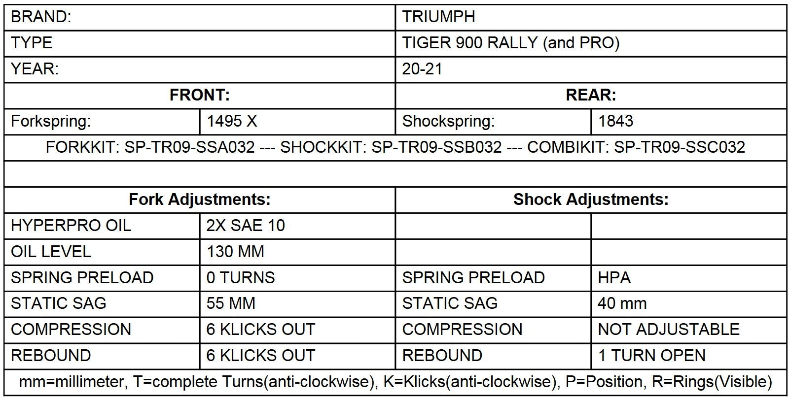 Ці прогресивні пружини вилки ідеально підходять до вилки Tiger 900 Rally. Вони роблять вилку кращою для вимог мотоциклетного туризму. Ви також відчуєте значно покращену реакцію та більші резерви в екстремальних ситуаціях. Інформація: підходить лише для вАЬTiger 900 Rally / Rally Pro (2020-2024)вАЭ Як і у випадку з усіма рішеннями підвіски, задню та передню частини мотоцикла слід змінювати разом. Відповідні компоненти для задньої частини Tiger 900 Rally / Rally Pro можна знайти в нашій рекомендації щодо аксесуарів Наша рекомендація: зверніться до спеціалізованої майстерні зі встановлення запасних пружин. У тому числі: - Заміна пружин для оригінальної вилки. - Відповідне масло для вилок. - Паста для зменшення тертя в нижніх трубах вилки. - Містить докладні інструкції зі встановлення. У вас є додаткові запитання? Будемо раді проконсультувати Вас особисто. Електронна адреса: suspension@suspension.de Телефон +49 (0)7728-9279-1555 Будь ласка, скористайтеся нашим аркушем перевірки шасі та надішліть нам заповнену форму.