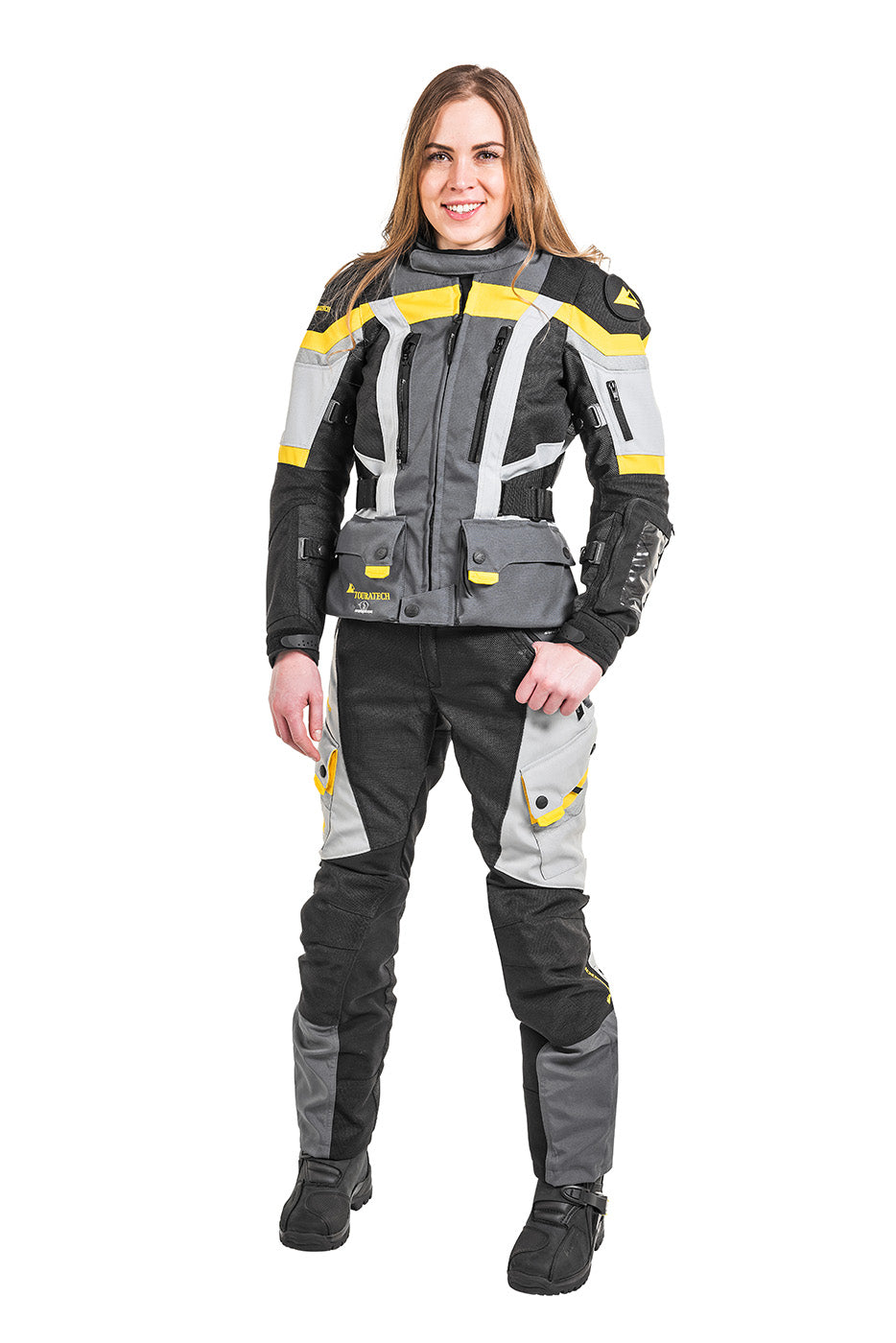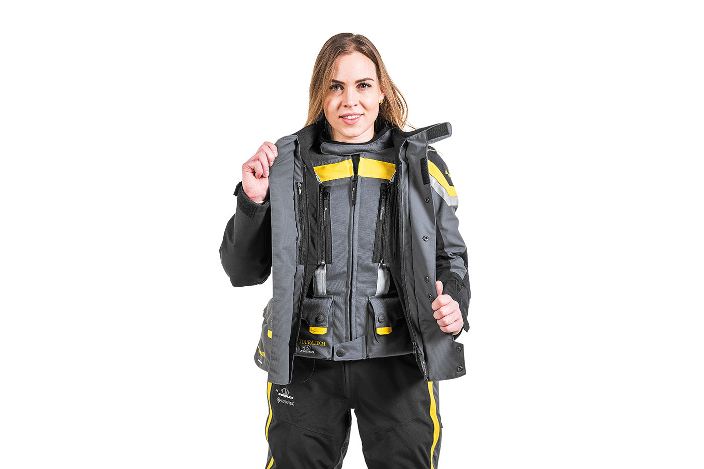 Розумним кроком буде спершу спустошити кишені та покласти необхідні речі в кишені цього верхнього одягу. Вони просторі, легкодоступні та, звісно, водонепроникні! Touratech обрала тришаровий ламінат GORE-TEX® (CORDURA®). У цьому текстильному композитному матеріалі внутрішня підкладка, високоякісна дихаюча мембрана GORE-TEX® і міцний зовнішній шар скріплені в одну тканину. Це означає, що ламінат не надто громіздкий, не здувається і завжди щільно прилягає. Звичайно, найважливішими властивостями комбінезону є вітро- та водонепроникність. А оскільки тришаровий ламінат GORE-TEX® (CORDURA®) є активним матеріалом, костюм повністю пропускає повітря.