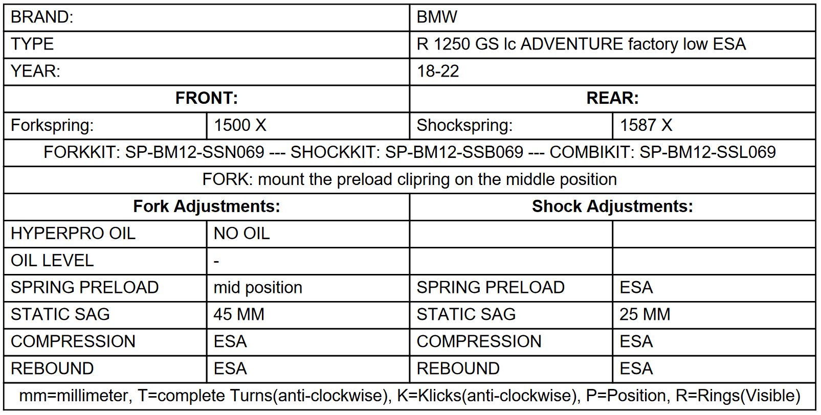 Цей комплект прогресивних змінних пружин був розроблений, щоб ідеально відповідати BMW R1250GS Adventure із заводським опусканням і запропонувати «надзвичайне покращення» реакції та більшу безпеку в екстремальних ситуаціях. Заміна передньої та задньої пружин призведе до значного покращення та більшого задоволення від мандрівки на вашому мотоциклі. Інформація: підходить лише для «BMW R1250GS Adventure 2018-2022 рр. з BMW Dynamic ESA та оригінальним заводським пониженням» Наша рекомендація: переобладнання змінних пружин має проводити спеціалізована майстерня, особливо для амортизаторів ESA. У комплект поставки входить: - Змінна пружина передня для оригінальної підвіски BMW із заводським опусканням. - Заміна пружинна задня для оригінальної підвіски BMW із заводським заниженням.. - Інструкція з монтажу. У вас є додаткові запитання? Будемо раді проконсультувати Вас особисто. Електронна адреса: suspension@suspension.de Телефон +49 (0)7728-9279-1555 Будь ласка, скористайтеся нашим аркушем перевірки шасі та надішліть нам заповнену форму.