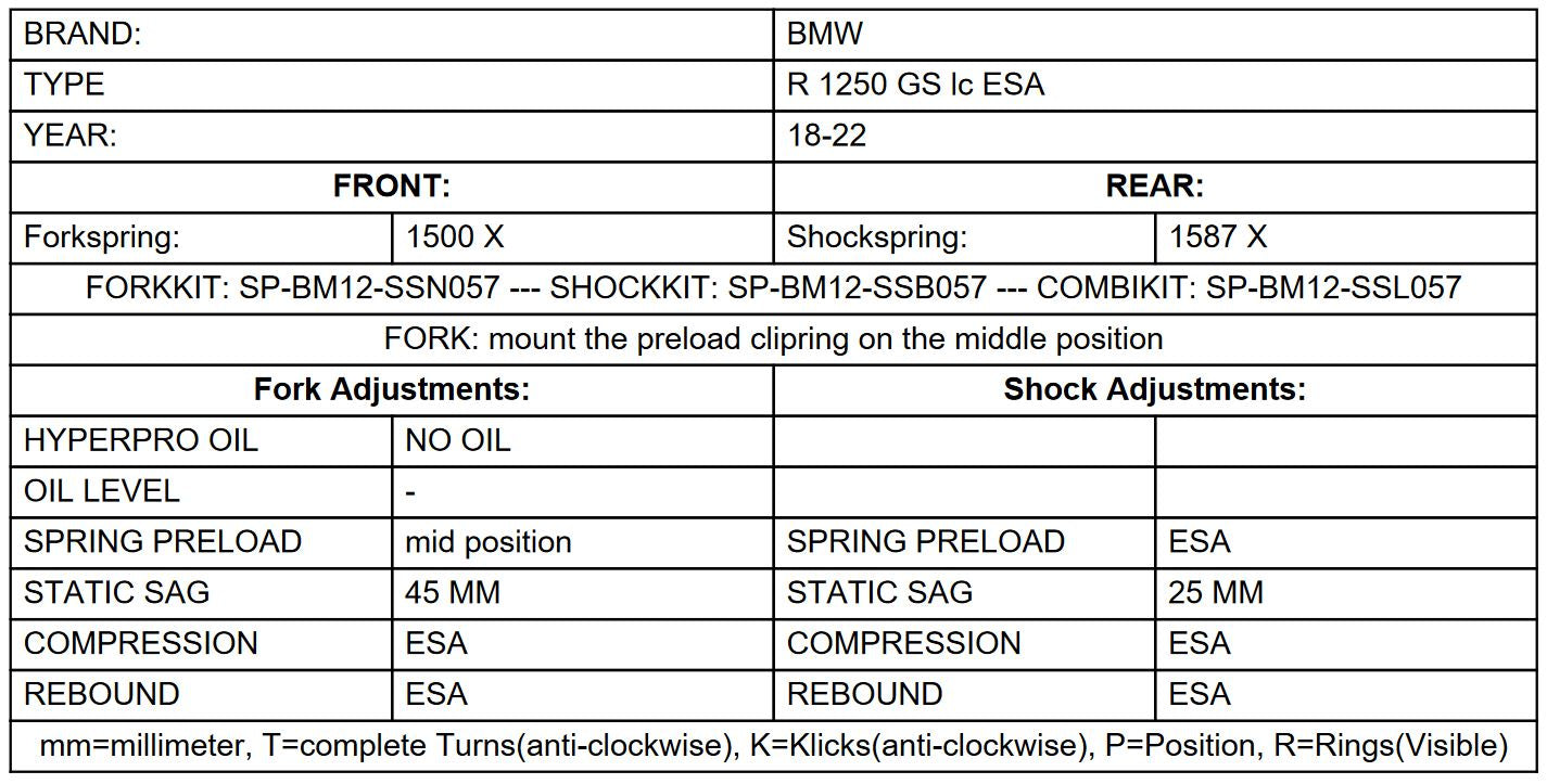 Прогресивні змінні пружини для амортизаторів для BMW R 1250 GS LC ESA 2018 - 2022. Цей набір прогресивних змінних пружин був розроблений, щоб ідеально відповідати вашому мотоциклу та запропонувати надзвичайно покращену реакцію та більшу безпеку в екстремальних ситуаціях. Заміна передньої та задньої пружин призведе до значного покращення та більшого задоволення від мандрівки на вашому мотоциклі. Поставка включає: змінну пружину для оригінального переднього амортизатора - змінну пружину оригінального заднього амортизатора - докладні інструкції з монтажу. Наша рекомендація: заміна пружин для заміни повинна проводитись у спеціалізованій майстерні. У вас є додаткові запитання? Будемо раді проконсультувати Вас особисто. Електронна адреса: suspension@touratech.de Телефон +49 (0)7728-9279-1555 Будь ласка, скористайтеся нашим аркушем перевірки шасі та надішліть нам заповнену форму.