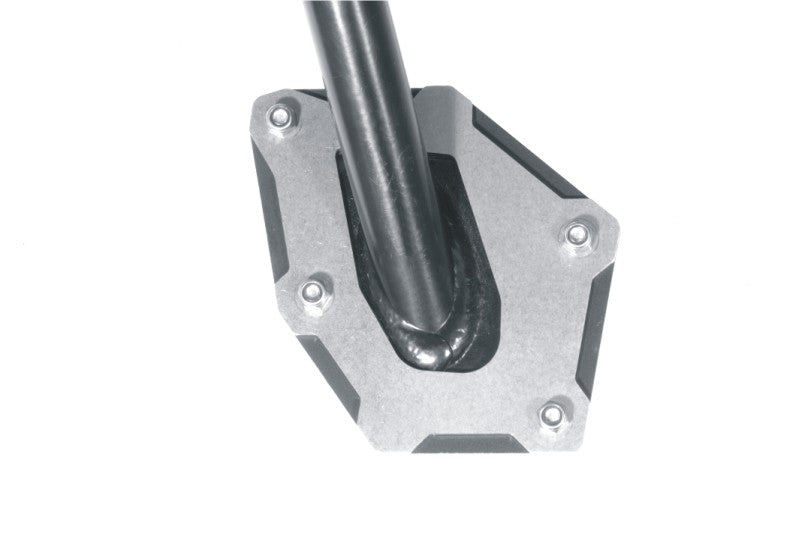 Завдяки цьому подовженню стійки R 1200 GS стоїть набагато міцніше навіть на досить м’якій поверхні. Навіть якщо ви припаркуєте мотоцикл на галявині, вам не завжди доведеться шукати дерев’яну дошку чи іншу основу. Ця практична деталь виготовлена з поєднання деталей лазера з нержавіючої сталі та анодованого алюмінію. Швидко та легко встановлюється. Не підходить для підвіски деталей комплекту опускання