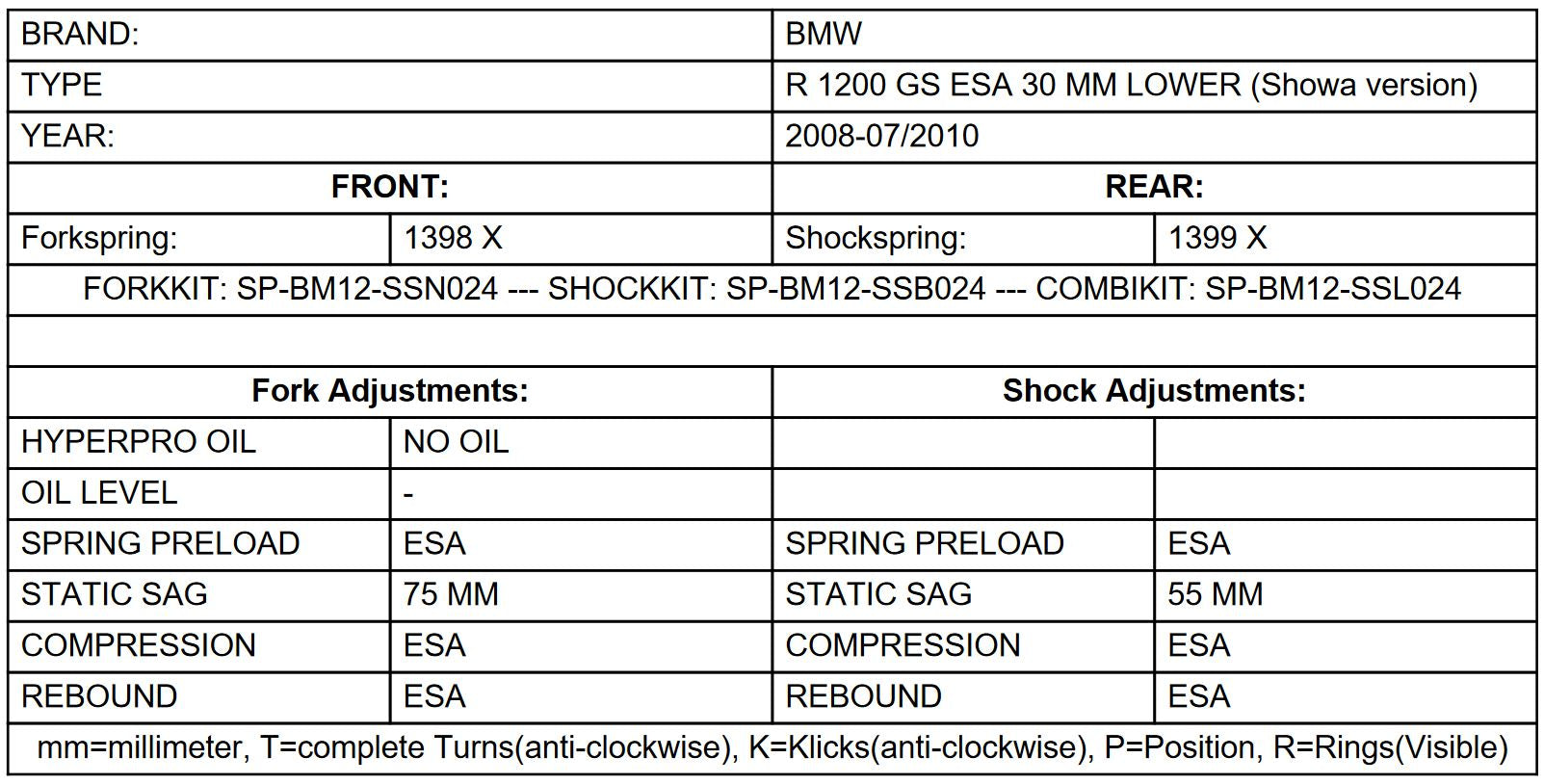 Комплект для зниження висоти - Змінні пружини 30 мм для BMW R 1200 GS ESA 2007 - 2010 Комплект для зниження висоти від Touratech Suspension. В комплект входять змінні пружини амортизатора спереду і ззаду. Цей комплект пружин забезпечує значне зменшення висоти без шкоди для ходових якостей - за рахунок невеликого кліренсу. Прогресивні пружини були розроблені, щоб ідеально підходити до вашого мотоцикла та запропонувати надзвичайно покращену реакцію та більшу безпеку в екстремальних ситуаціях. Заміна передніх і задніх пружин призведе до значного поліпшення вашої підвіски. Вулиця легальна. Наша рекомендація: зверніться до спеціалізованої майстерні зі встановлення запасних пружин. Інформація: може знадобитися відрегулювати довжину бічної та основної підставок. У комплект поставки входить - Змінна пружина для оригінального переднього амортизатора. - Заміна пружини оригінального заднього амортизатора. - Включаючи докладні інструкції з монтажу. У вас є додаткові запитання? Будемо раді проконсультувати Вас особисто. Електронна адреса: suspension@touratech.de Телефон +49 (0)7728-9279-1555 Будь ласка, скористайтеся нашим аркушем перевірки шасі та надішліть нам заповнену форму.