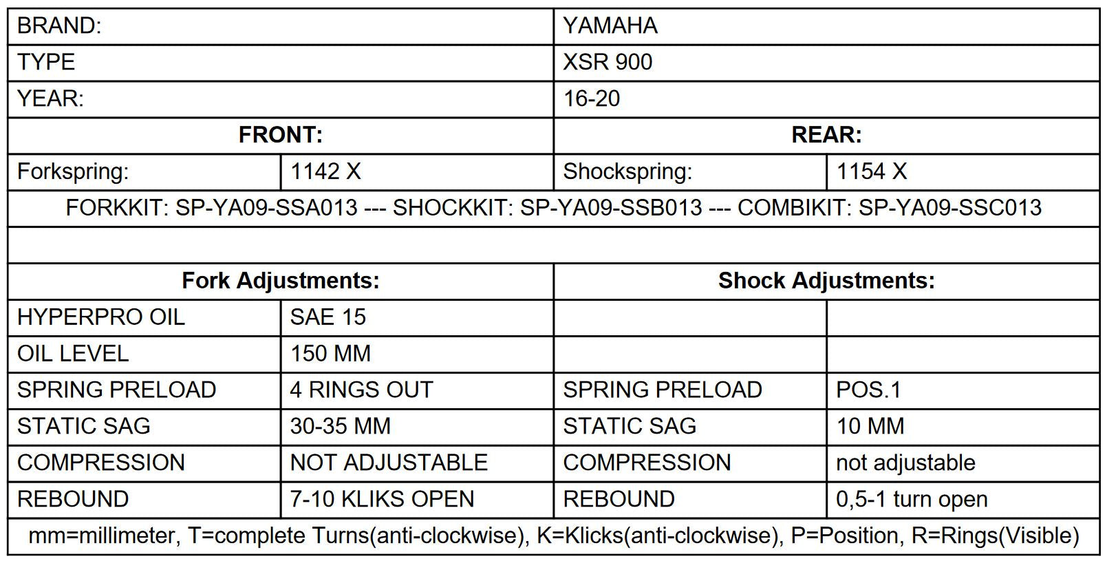 Прогресивні змінні пружини для вилки та амортизатора для Yamaha XSR 900 2016 - 2020. Цей набір прогресивних змінних пружин був розроблений, щоб ідеально відповідати вашому мотоциклу та запропонувати надзвичайно покращену реакцію та більшу безпеку в екстремальних ситуаціях. Заміна передньої та задньої пружин призведе до значного покращення та більшого задоволення від мандрівки на вашому мотоциклі. Поставка включає: пружини вилки - запасну пружину для оригінального амортизатора - докладні інструкції з монтажу - правильну оливу для вилки - пасту для покращення ковзання напірних трубок. Наша рекомендація: заміну пружин на заміну має виконувати спеціалізована майстерня. У вас є додаткові запитання? Будемо раді проконсультувати Вас особисто. Електронна адреса: suspension@touratech.de Телефон +49 (0)7728-9279-1555 Будь ласка, скористайтеся нашим аркушем перевірки шасі та надішліть нам заповнену форму.