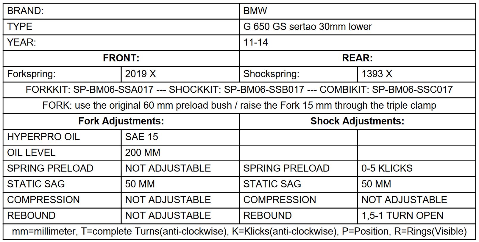 Комплект для зниження висоти - Змінні пружини 30 мм для BMW G 650 GS Sertao 2011 - 2014 Комплект для зниження висоти від Touratech Suspension. У комплект входять змінні пружини вилки і змінна пружина амортизатора. Цей комплект пружин забезпечує значне зменшення висоти без шкоди для ходових якостей - за рахунок невеликого кліренсу. Прогресивні пружини були розроблені, щоб ідеально підходити до вашого мотоцикла та запропонувати надзвичайно покращену реакцію та більшу безпеку в екстремальних ситуаціях. Заміна передніх і задніх пружин призведе до значного поліпшення вашої підвіски. Вулиця легальна. Наша рекомендація: зверніться до спеціалізованої майстерні зі встановлення запасних пружин. Інформація: може знадобитися відрегулювати довжину бічної та основної підставок. У комплект поставки входить - Пружини вилки для оригінальної вилки - Змінна пружина для оригінального амортизатора. - Включаючи докладні інструкції з монтажу. - Відповідне масло для вилок. У вас є додаткові запитання? Будемо раді проконсультувати Вас особисто. Електронна адреса: suspension@touratech.de Телефон +49 (0)7728-9279-1555 Будь ласка, скористайтеся нашим аркушем перевірки шасі та надішліть нам заповнену форму.
