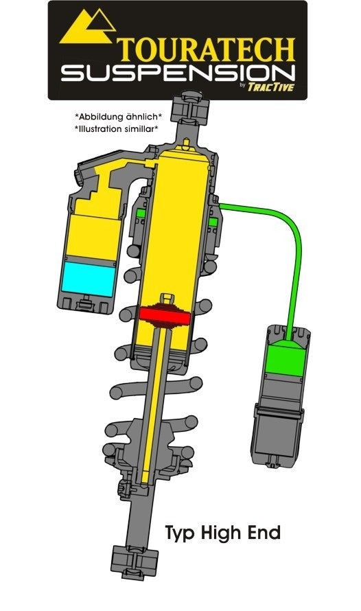 Цей амортизатор High End для Triumph Tiger 800 XC ідеально підходить для подорожей і мандрівки з частими різкими змінами навантаження та умов мандрівки. Його дуже великий діапазон регулювання дозволяє компенсувати будь-який тип навантаження, від хвостової сумки до повністю завантаженої системи багажу та/або пасажира на задньому сидінні. Ви можете легко і швидко відновити баланс мотоцикла за допомогою маховика, який регулює попереднє натяг пружини. Дуже точне регулювання амортизації на зовнішньому резервуарі дозволяє ефективно й точно налаштувати підвіску відповідно до вашого особистого стилю мандрівки в будь-який час, за будь-яких умов дороги та для будь-яких цілей – автостради, головні дороги, звивисті сільські смуги, бездоріжжя, подорожі на далекі відстані з великою кількістю багажу або для стрімкого, сміливого стилю мандрівки. Ви відчуєте абсолютно нові відчуття від мандрівки на своєму мотоцикл. Короткий огляд фактів:=> Цей амортизатор налаштований і налаштований готовий до використання на основі нашого досвіду роботи з Triumph Tiger 800 XC.=> Параметри такі: вага автомобіля / точка повороту амортизатора / конструктивні обмеження / тестові поїздки.=> Цей амортизатор розрахований на вагу водія, включаючи багаж до 100 кг.=> Як і у всіх підвісках, задня і передню частину мотоцикла слід модифікувати разом.=> У цьому випадку відповідним компонентом для передньої частини Triumph Tiger 800 XC є=> Прогресивні змінні пружини вилки, Triumph Tiger 800 XC Артикул: 01-420-5838-0=> Якщо змінити лише один компонент, оптимальне керування не буде досягнуто. Характеристики амортизатора Touratech Suspension High End => Корпус амортизатора виготовлений з алюмінію. *** Завдяки цьому його вага зводиться до мінімуму. => Усі вузли та компоненти розроблені для інтенсивного використання на важких туристичних мотоциклах. => Встановлено спеціальні ущільнювачі з низьким коефіцієнтом тертя.*** Як наслідок, знос дуже низький, а амортизатор має тривалий термін служби.=> Міцні втулки з нержавіючої сталі для кріпильних болтів встановлені на вушко пружини. *** Вони забезпечують міцне кріплення кріпильного болта без люфту навіть за максимальних навантажень.=> Конструкція з плаваючим поршнем. Плаваючий поршень розділяє амортизаційні рідини – масло та азот – дозволяючи їм працювати окремо.*** Забезпечує кращу реакцію амортизатора. *** Це забезпечує точне, високоефективне демпфування навіть при дуже високій частоті демпфування (погані дороги, ґрунтові траси). *** Амортизатор краще охолоджує. *** Мінімальні обмеження щодо положення амортизатора на мотоциклі. => Гідравлічне попереднє натяг високого класу через легкодоступне, добре розташоване маховик. => Налаштування амортизаторів були розроблені відповідно до досвіду та вимог Touratech.*** Вони засновані на багатьох пройдених милях і досвіді, отриманому під час використання командою Touratech Race Team.=> Регулювання амортизації стиснення High End завжди має окремі налаштування високої та низької швидкості.*** Це дозволяє індивідуально регулювати стиснення/відскок. Ідеальна адаптація до мінливих вимог.=> Окремий зовнішній резервуар високого класу в демпферному вузлі амортизатора.*** Система амортизатора краще охолоджується під час мандрівки.*** Надає амортизатору більшу стійкість і довший термін служби.=> QR-код на амортизаторі містить індивідуальні дані амортизатора.*** Просто відскан