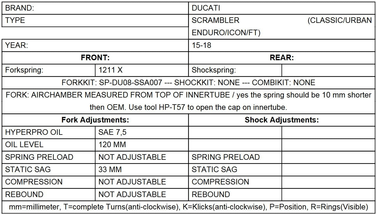 Ці безперервно прогресивні пружини вилки ідеально підходять до оригінальної вилки в Ducati Scrambler. Вони дають вилці найкраще налаштування та контроль переднього колеса. Пружини вилки з високою підвіскою BLACK-T забезпечують значно покращену реакцію та вищі запаси в граничному діапазоні..   Інформація: Підходить лише до оригінальної вилки " Ducati Scrambler з 2015 року".   Як і у випадку з усіма рішеннями підвіски, задню та передню частини мотоцикла слід змінювати разом. - Якщо змінити лише один компонент, оптимального керування не буде досягнуто. - Відповідні компоненти для вашого мотоцикла можна знайти в аксесуарах цієї статті.   вАЬПрокрутіть униз.вАЭ   Комплект поставки: - Заміна пружин на оригінальну вилку. - Відповідне масло для вилок. - Паста для зменшення тертя в нижніх трубах вилки. - Містить докладні інструкції зі встановлення.   У вас є додаткові запитання? Будемо раді проконсультувати Вас особисто. Електронна адреса: suspension@black-t-parts.com Телефон +49 (0)7728-9279-1555 Будь ласка, скористайтеся нашим аркушем перевірки шасі та надішліть нам заповнену форму.